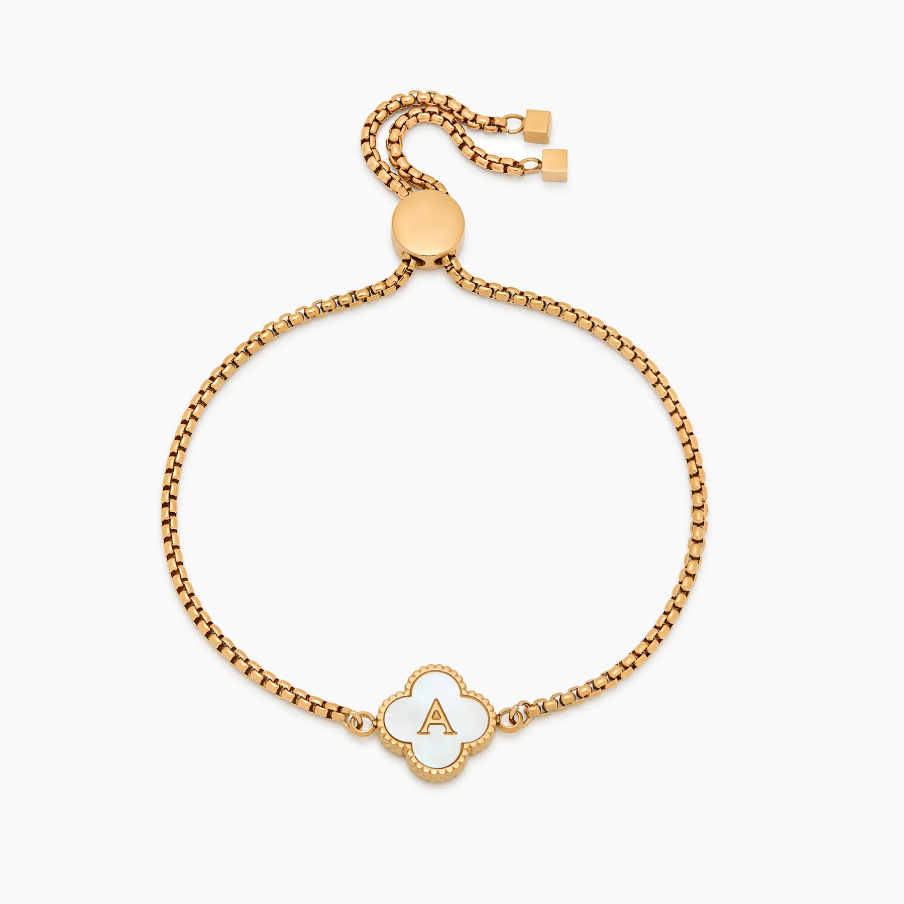 Refined, radiant and made just for you, our Mother of Pearl Clover Initial Bracelet is where elegance meets personal meaning. The glowing clover, inlaid with genuine mother of pearl and finished with an initial of your choice, brings a soft charm to your everyday style. Whether it is your own letter or one that honours someone close to your heart, this piece adds a little extra light to your stack, making it timeless, giftable and effortlessly you.