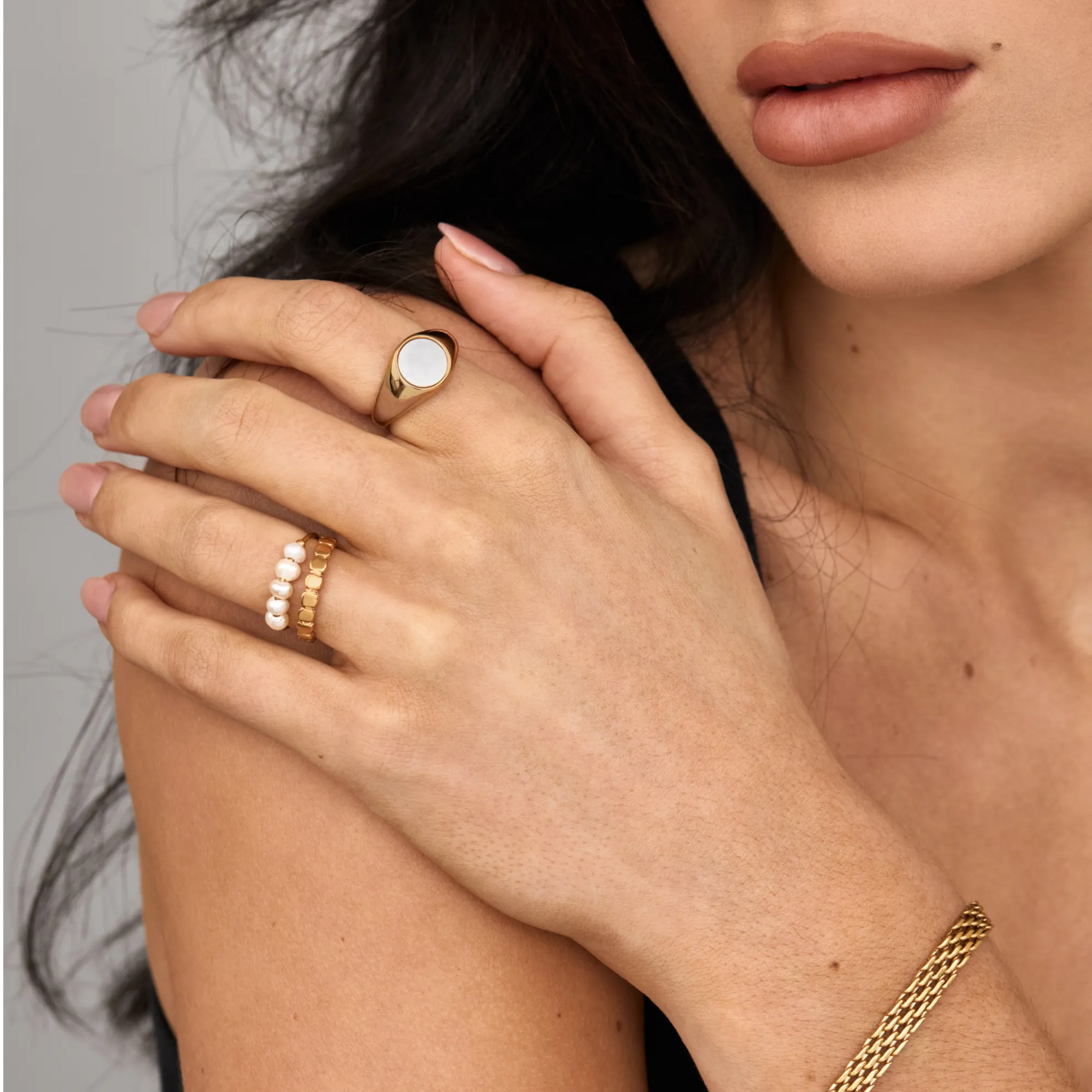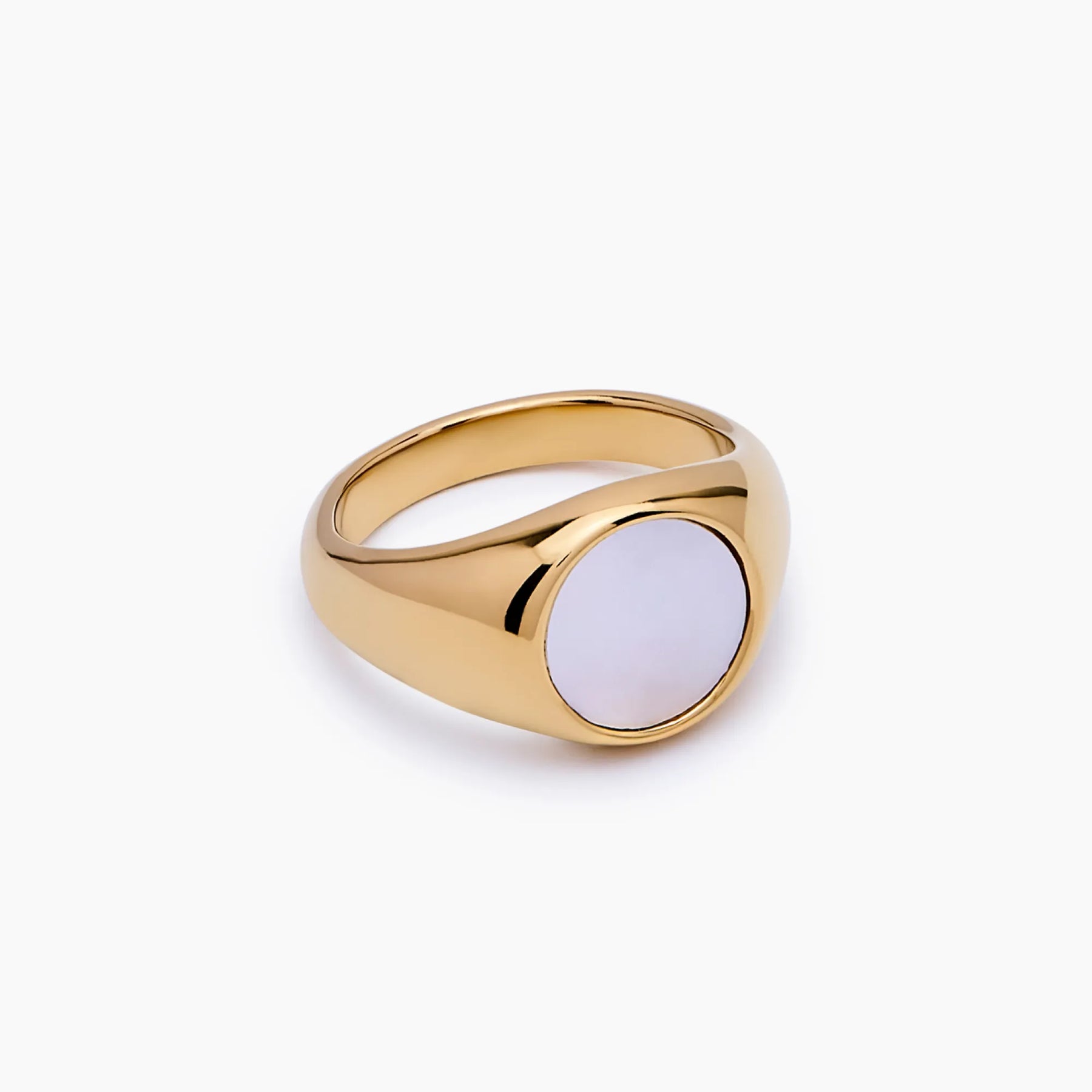 A quiet kind of shine. Let your intuition lead the way with our Mother of Pearl Ring, a piece admired for its calming energy and natural glow. The iridescent face catches the light beautifully, while the polished band adds a touch of timeless warmth. Perfect for those who believe true beauty begins within.