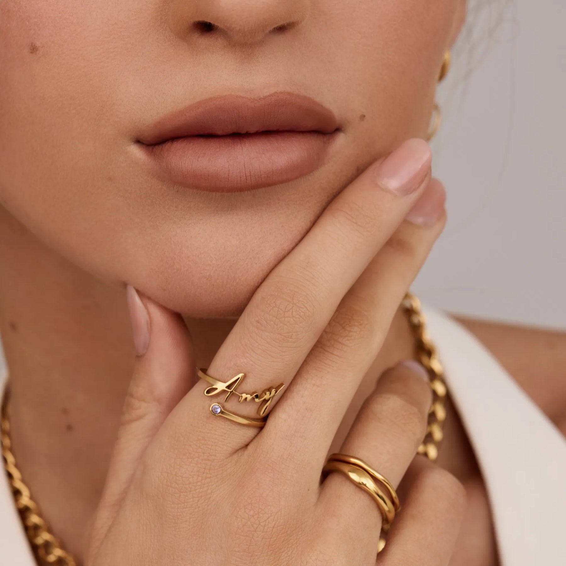 Our personalized open band wraps gently around your finger, with a name that speaks to your heart and a birthstone that adds just the right glint of light. Delicate yet full of meaning, it’s designed to feel like a part of you effortlessly elegant, endlessly personal. Whether it’s a gift or a little love note to yourself, this ring turns everyday wear into something unforgettable.